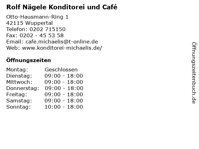 Suchen sie andere unternehmen aus der kategorie cafes bars bierhaeuser in wuppertal auf infobel. Naegele rolf konditorei und cafe otto hausmann ring 1 42115 wuppertal 0202 715150 wwwkonditorei michaelisde mit oeffnungszeiten anfahrt und erfahrungsberichten. Taeglich bieten wir ihnen darueber hinaus in unseren cafes.