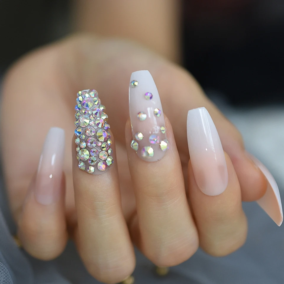 - 3d Rhinestones Gem Ombre Gradient Pink Nude French Ballerina Press On False Nails Extra Long Natural Coffin Uv Fake Fingers Nail False Nails Aliexpress