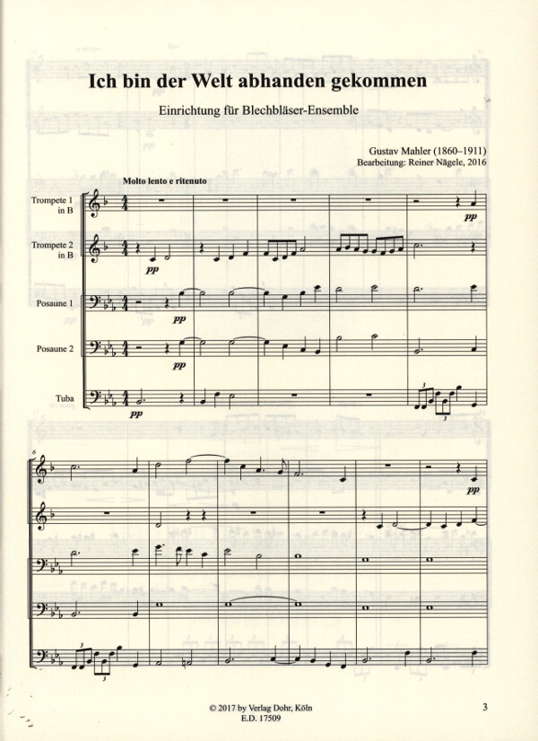 Mahler Gustav Arr Reiner Nagele Ich Bin Der Welt Abhanden Gekommen Fur Blechblaserquintett 2 Tr 2 Pos 1 Tuba Blechblasersortiment Kobl French Naegel Weiss