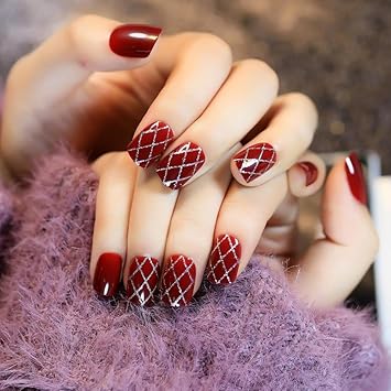 24 Pcs Massiv Weinrot Mit Silber Glitzer Kreuz Line Mesh Urlaub Square Kurz Full Cover Acryl Falsche Nagel Amazon De Beauty Naegel Zweifarbig